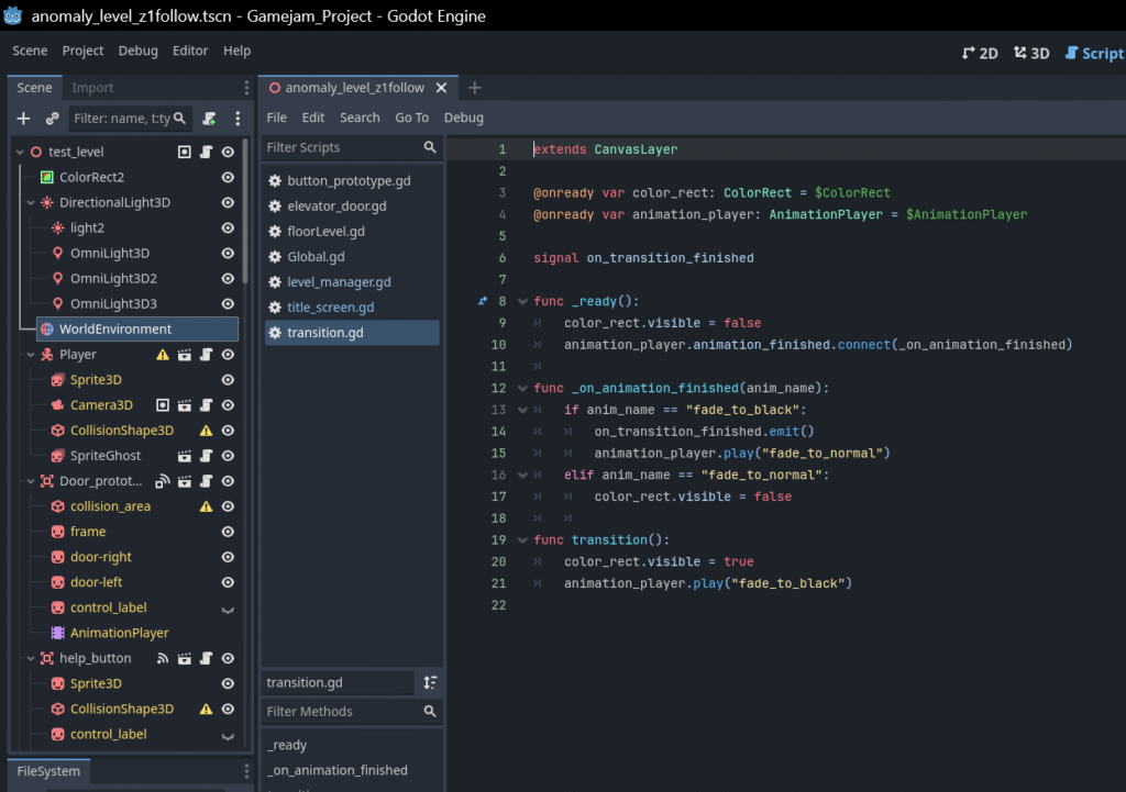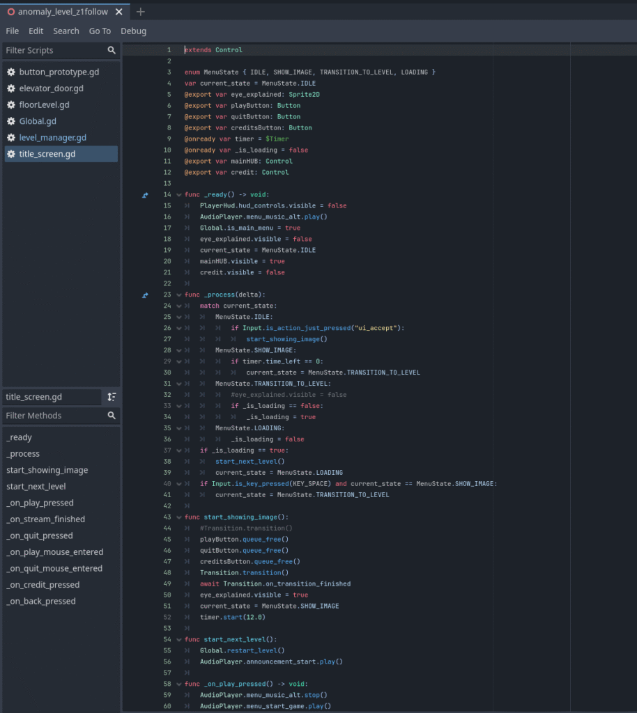 Haley took on UI, Programming, and Level Design roles within the team, helping out where others may need the assistance. Research she had conducted led to Shepard’s GDC talk of interactive storytelling through the environment, which met up nicely with Keep Calm, Stay Alert’s spatial anomaly gameplay by using a change in environment as visual cues to whether the player should report weird occurrences or continue towards their goal. Chow’s GDC talk of integrating UI into the environment was considered when creating the game and inspired Haley to use the elevator display screen to show the player what floor they were on rather than using an immersion breaking HUD element.